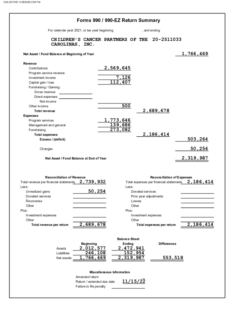 CHILDR1033 11/29/2022 2:09 Forms 990 / 990EZ Return Summary, and ending calendar year 2021, or tax year beginningCHILDREN\'S CANCER PARTNERS OF THE 202511033 CAROLINA, INC. 1,766,469Net Asset / Fund