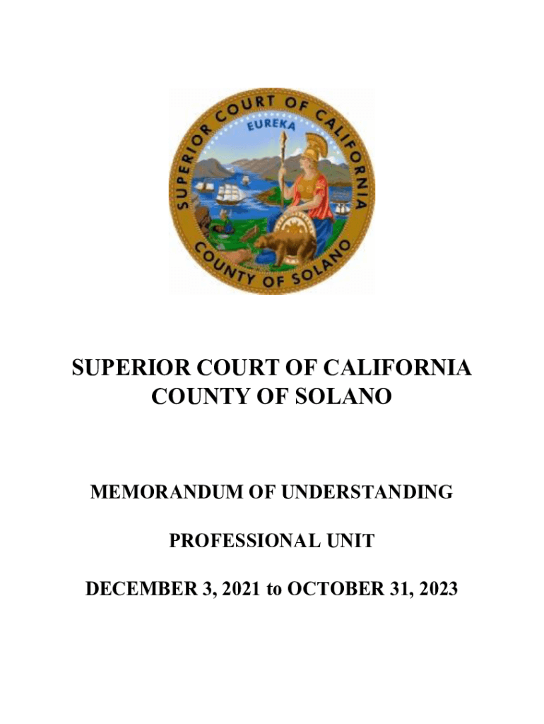 SUPERIOR COURT OF CALIFORNIA COUNTY OF SOLANOMEMORANDUM OF UNDERSTANDING PROFESSIONAL UNIT DECEMBER 3, 2021, to OCTOBER 31, 2023PREAMBLE ARTICLE 1 ARTICLE 2 ARTICLE 3 ARTICLE 4 A. B. C. D. E. F. G.