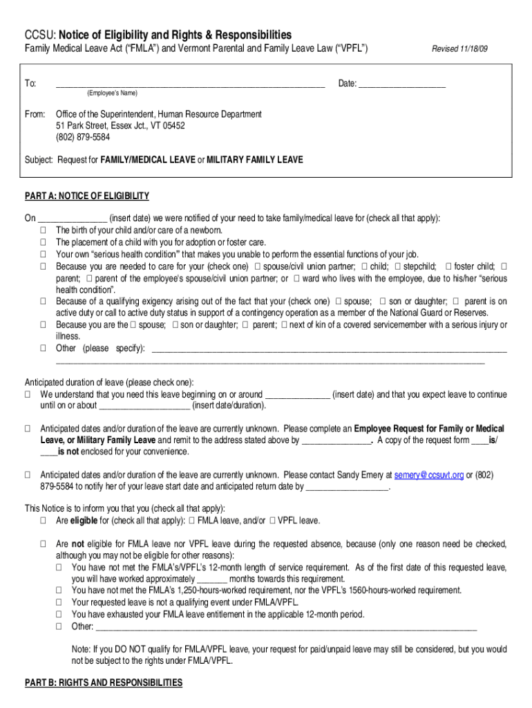 CSU: Notice of Eligibility and Rights & ResponsibilitiesFamily Medical Leave Act (FMLA) and Vermont Parental and Family Leave Law (EPFL) To:___Revised 11/18/09Date: ___(Employees Name)From:Office