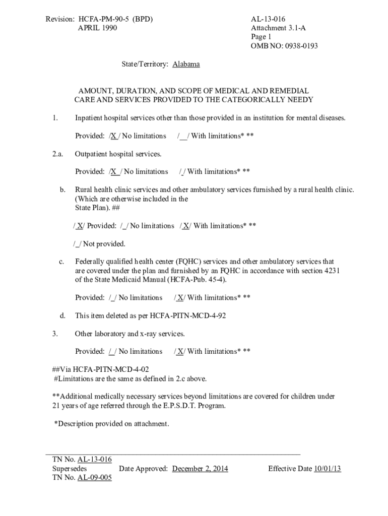 Revision: HCFAPM905 (BPD) APRIL 1990AL13016 Attachment 3.1A Page 1 OMB NO: 09380193State/Territory: Alabama AMOUNT, DURATION, AND SCOPE OF MEDICAL AND REMEDIAL CARE AND SERVICES PROVIDED TO THE CATEGORICALLY