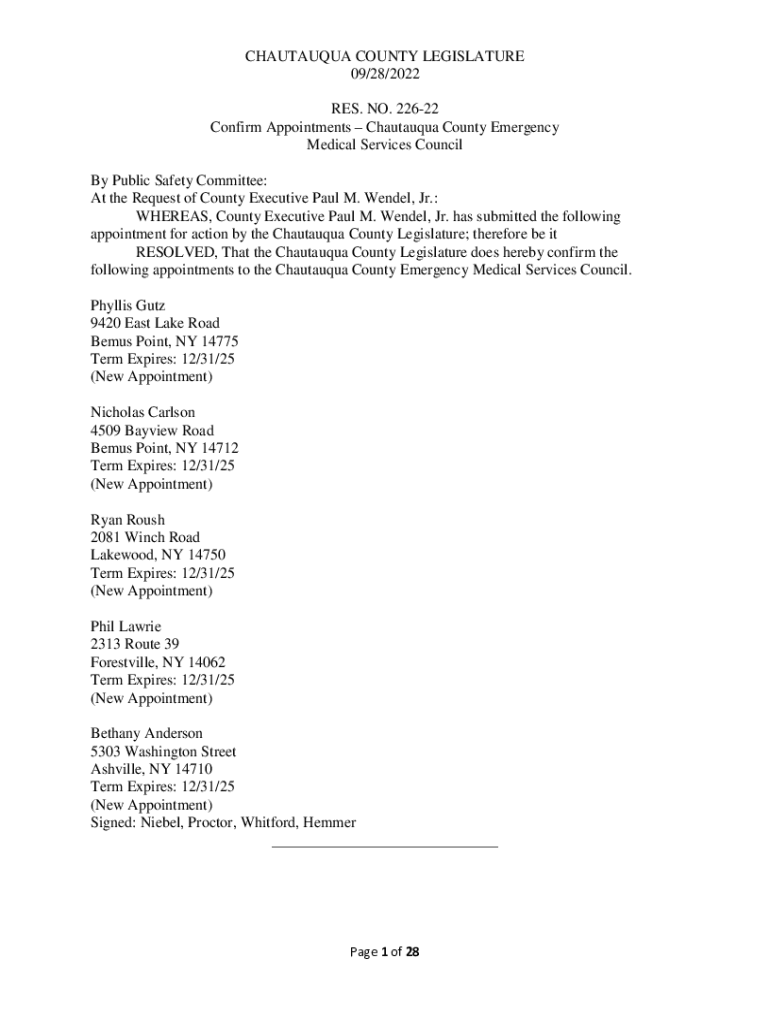 CHAUTAUQUA COUNTY LEGISLATURE 09/28/2022 RES. NO. 22622 Confirm Appointments Chautauqua County Emergency Medical Services Council By Public Safety Committee: At the Request of County Executive Paul