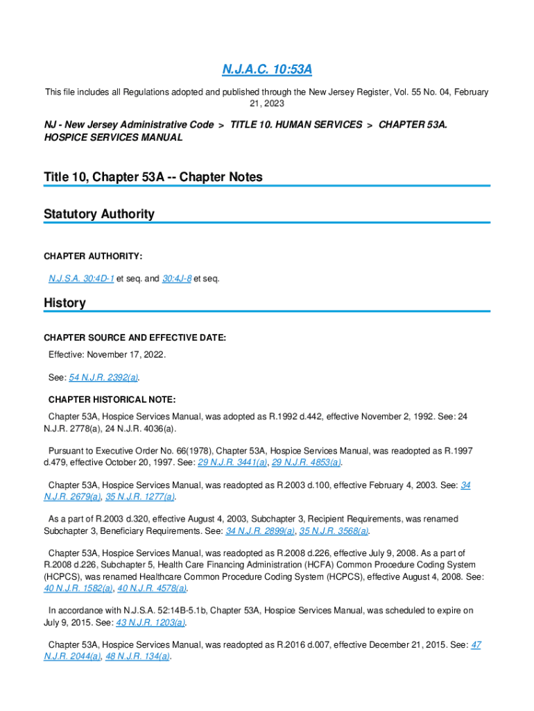 N.J.A.C. 10:53A This file includes all Regulations adopted and published through the New Jersey Register, Vol. 55 No. 04, February 21, 2023NJ New Jersey Administrative Code TITLE 10. HUMAN SERVICES