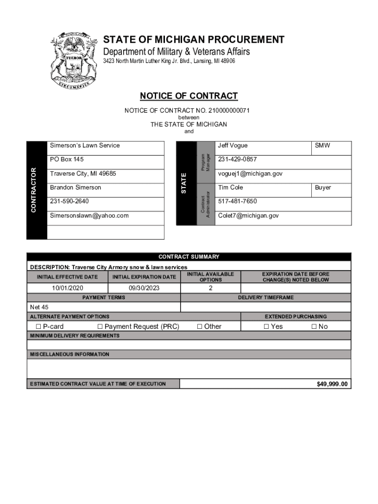 STATE OF MICHIGAN PROCUREMENT Department of Military & Veterans Affairs 3423 North Martin Luther King Jr. Blvd., Lansing, MI 48906NOTICE OF CONTRACT NOTICE OF CONTRACT NO. 210000000071. Between STATE