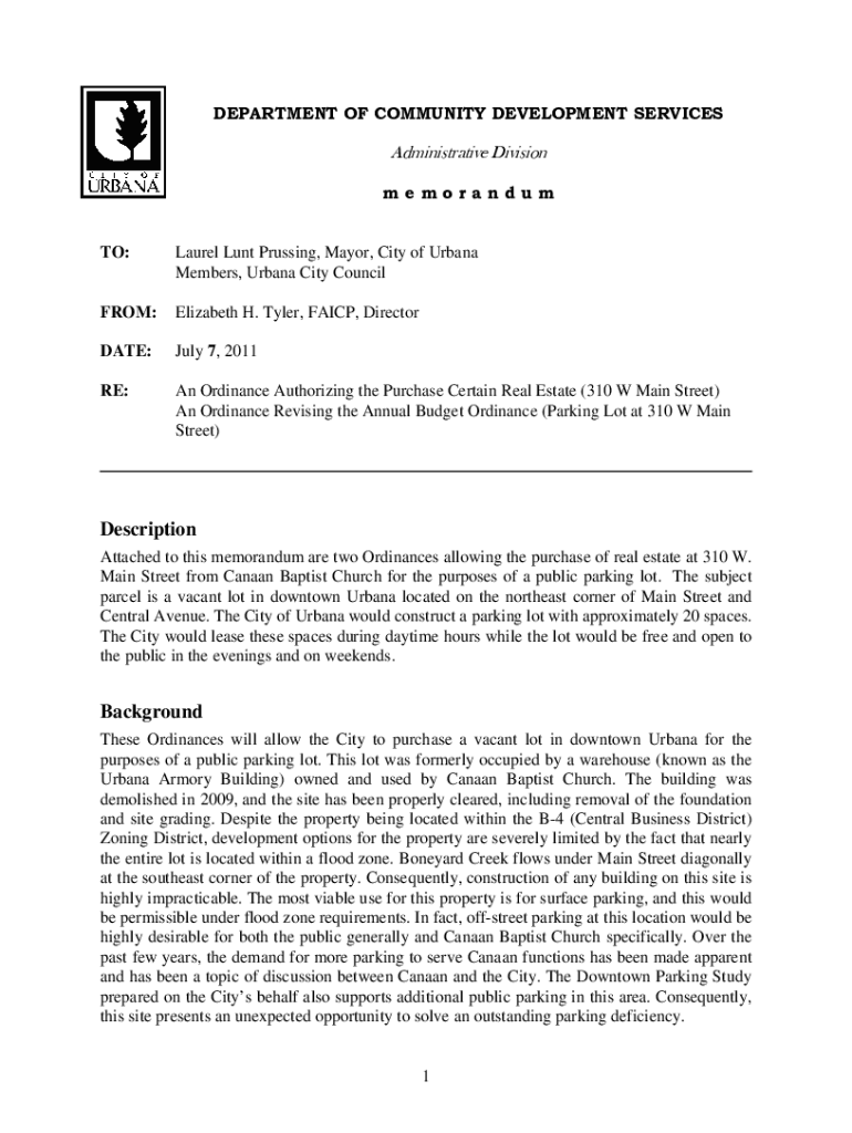 DEPARTMENT OF COMMUNITY DEVELOPMENT SERVICESAdministrative Division memorandum TO:Laurel Aunt Pressing, Mayor, City of Urbana Members, Urbana City Councilor:Elizabeth H. Tyler, FICP, Directorate:July