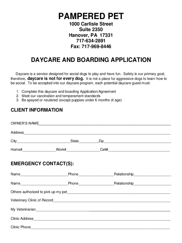 PAMPERED PET 1000 Carlisle Street Suite 2350 Hanover, PA 17331 7176342891 Fax: 7179698446DAYCARE AND BOARDING APPLICATION Daycare is a service designed for social dogs to play and have fun. Safety