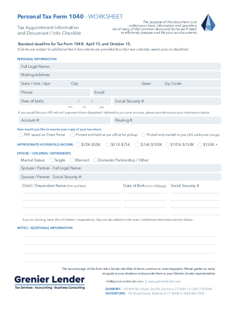 Personal Tax Form 1040 Worksheet purpose of this document is to collect your basic information and provide a list of many of the common items and forms well need to efficiently prepare and LE your