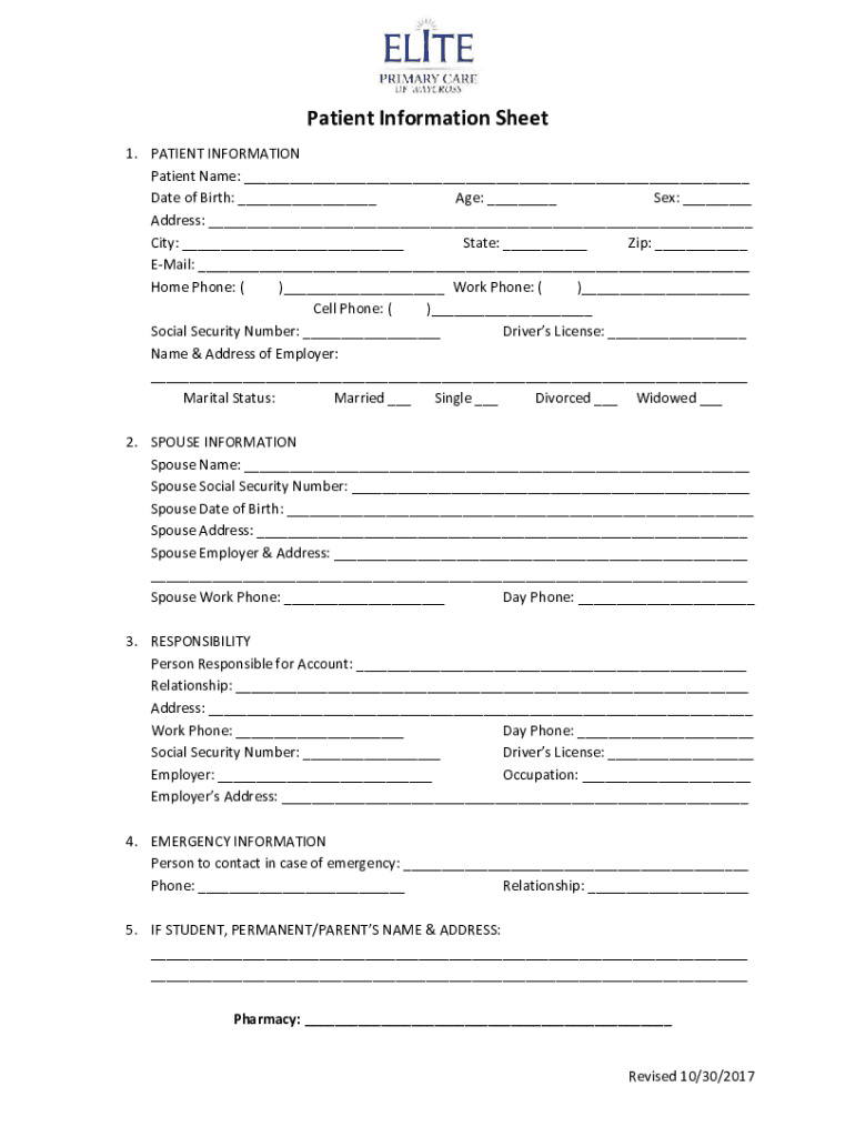 Patient Information Sheet 1. PATIENT INFORMATION Patient Name: ___ Date of Birth: ___ Age: ___ Sex: ___ Address: ___ City: ___ State: ___ Zip: ___ Email: ___ Home Phone: ()___ Work Phone: ()___ Cell