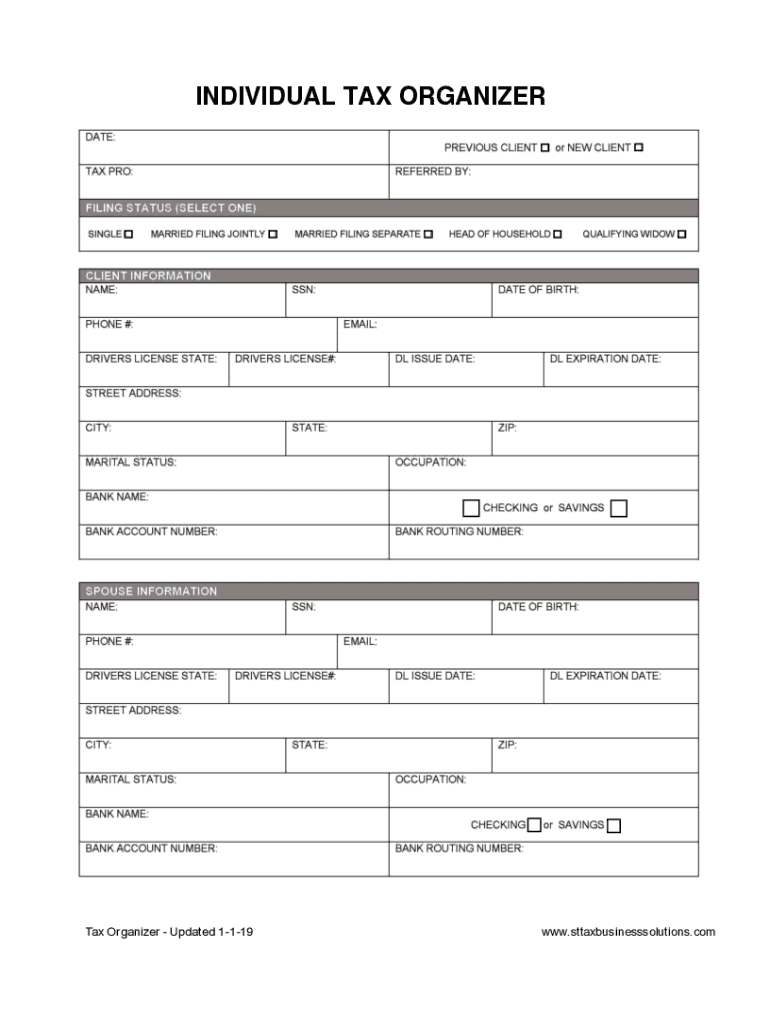 INDIVIDUAL TAX ORGANIZER(617) 2495201 www.sttaxbusinesssolutions.com info@sttaxbusinesssolutionsllc.comUse the tax checklist below to find the documents and forms you\'ll need to get started. PERSONAL