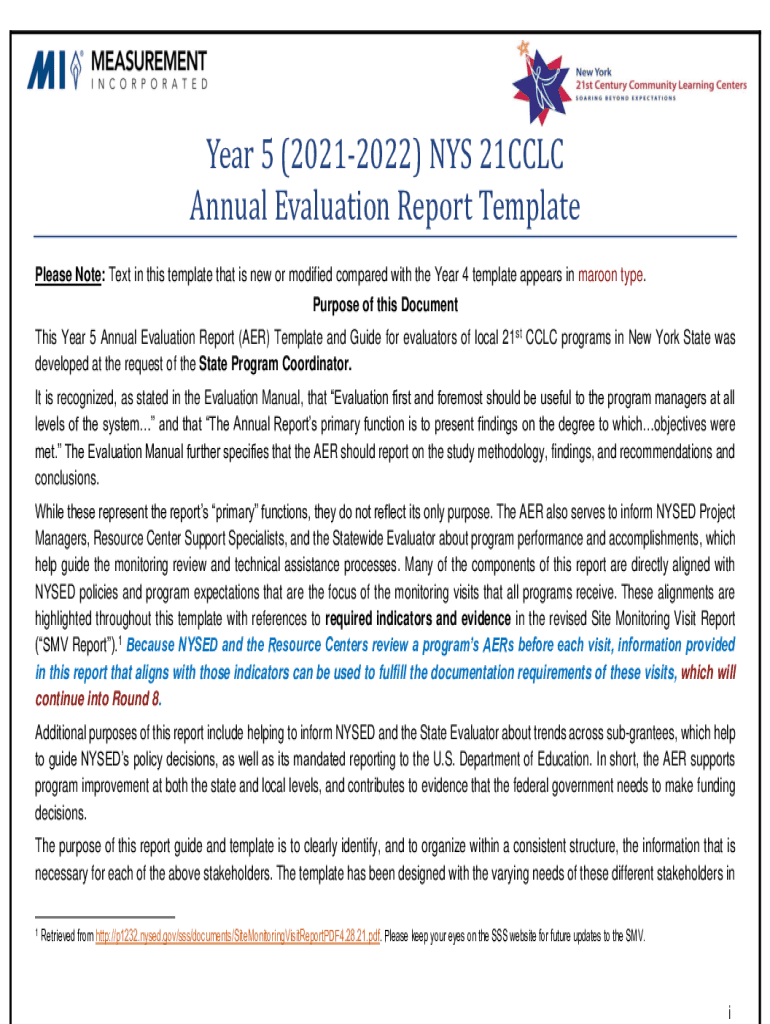 Year 5 (20212022) NYS 21CCLC Annual Evaluation Report Template Please Note: Text in this template that is new or modified compared with the Year 4 template appears in maroon type. Purpose of this