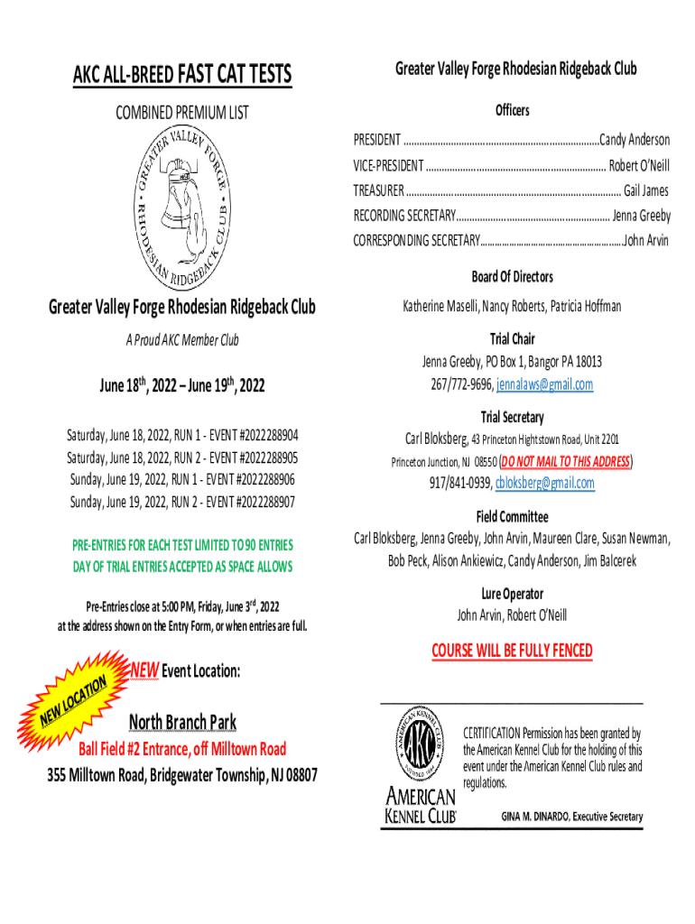 AKC ALLURED FAST CAT TESTS COMBINED PREMIUM Mistreated Valley Forge Rhodesian Ridge back Club Officers PRESIDENT .......................................................................... Candy Anderson