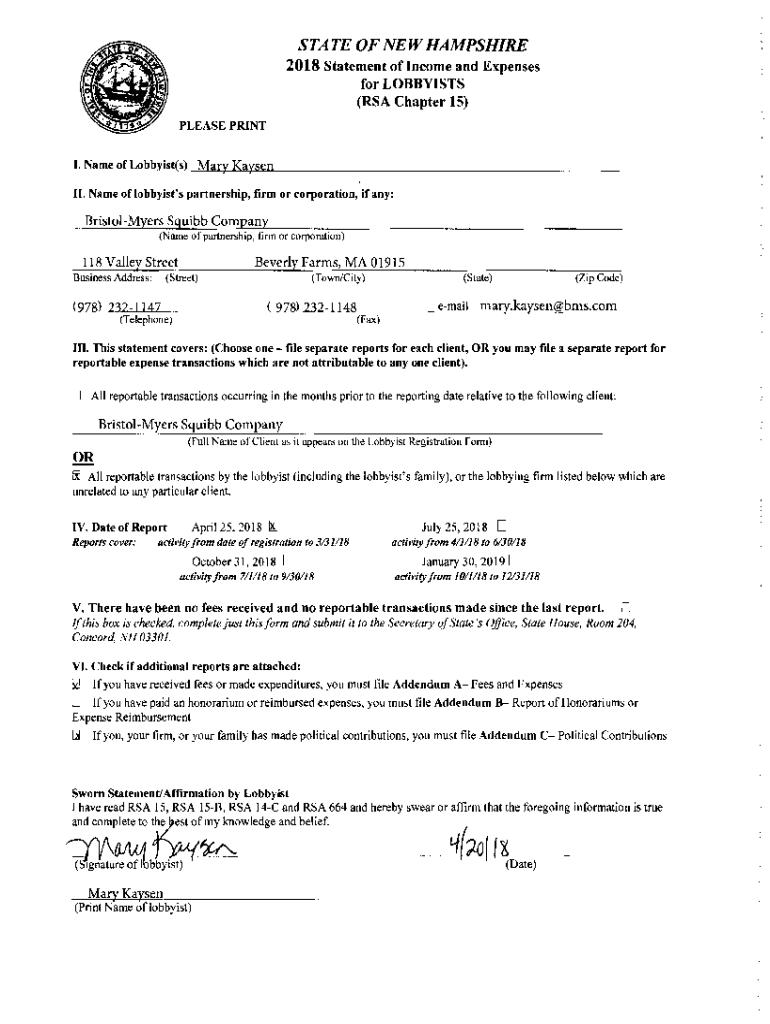 STATE OF NEW HAMPSHIRE 2018 Statement of Income and Expenses for LOBBYISTS (RSA Chapter 15) PLEASE PRINT I. Name lobbyist(s) _M\”\'\”\”\'a, ... Ry+\” K., a., y, _,’s,.e._, Wii. Name of lobbyist\'s