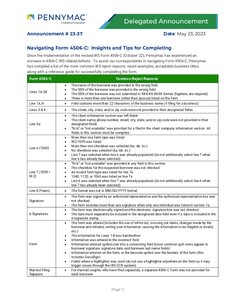 Delegated Announcement # 2337Date: May 23, 2023Navigating Form 4506C: Insights and Tips for Completing Since the implementation of the revised IRS Form 4506C (October 22), Penny mac has experienced