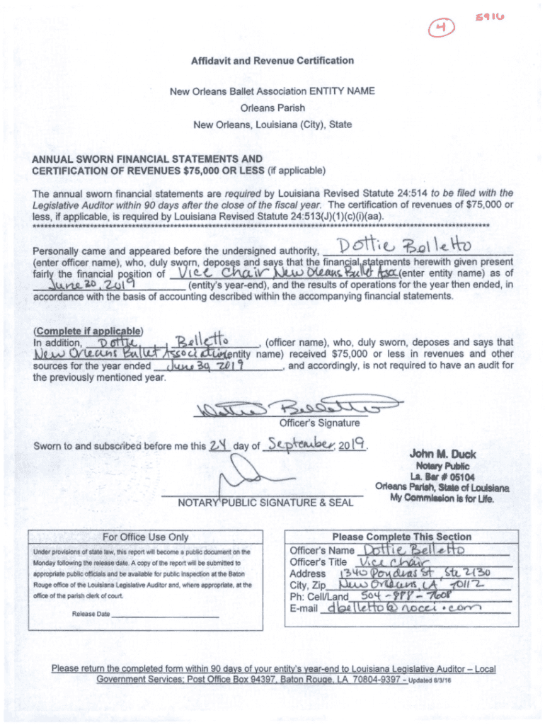 (3) Affidavit and Revenue Certification New Orleans Ballet Association ENTITY NAME Orleans Parish New Orleans, Louisiana (City), StateANNUAL SWORN FINANCIAL STATEMENTS AND CERTIFICATION OF REVENUES