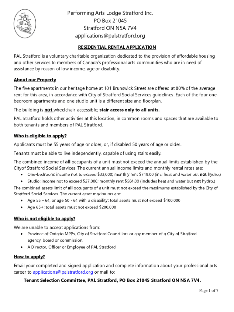 Performing Arts Lodge Stratford Inc. PO Box 21045 Stratford ON N5A 7V4 applications@palstratford.org RESIDENTIAL RENTAL APPLICATION PAL Stratford is a voluntary charitable organization dedicated to