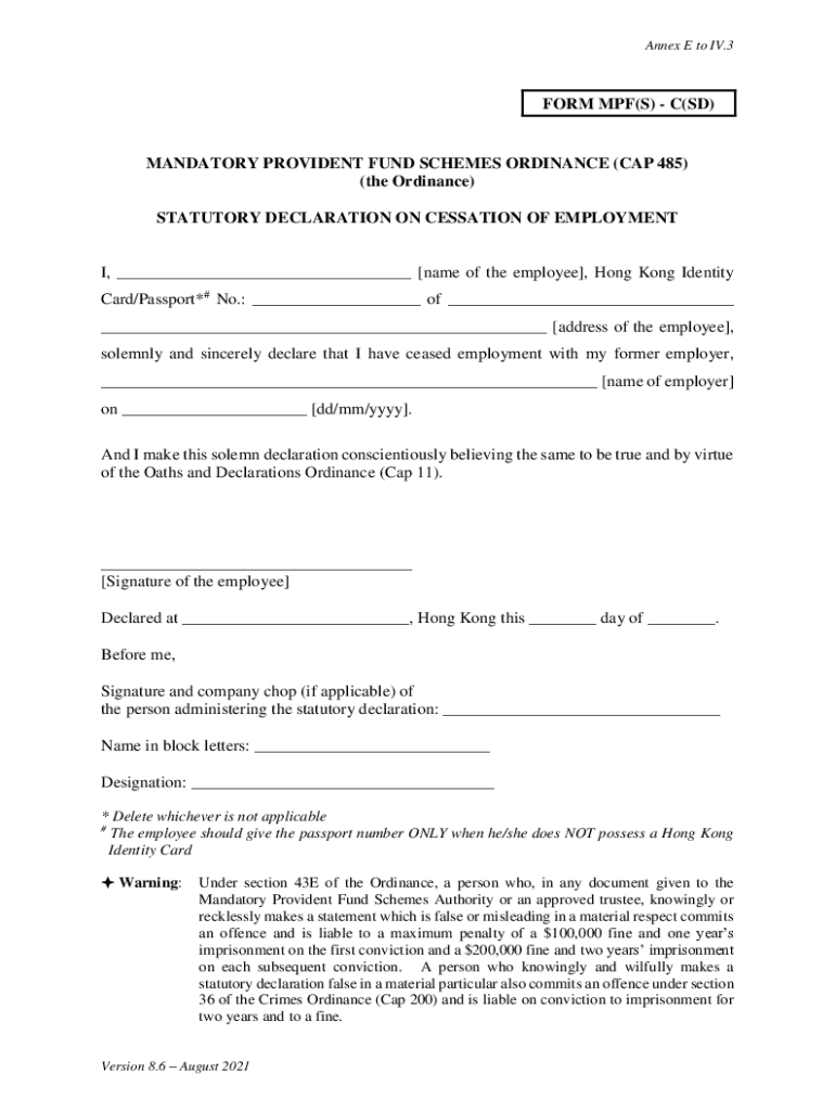 Annex E to IV.3FORM MPH(S) C(SD)MANDATORY PROVIDENT FUND SCHEMES ORDINANCE (CAP 485) (the Ordinance) STATUTORY DECLARATION ON CESSATION OF EMPLOYMENT, ___ [name of the employee], Hong Kong Identity