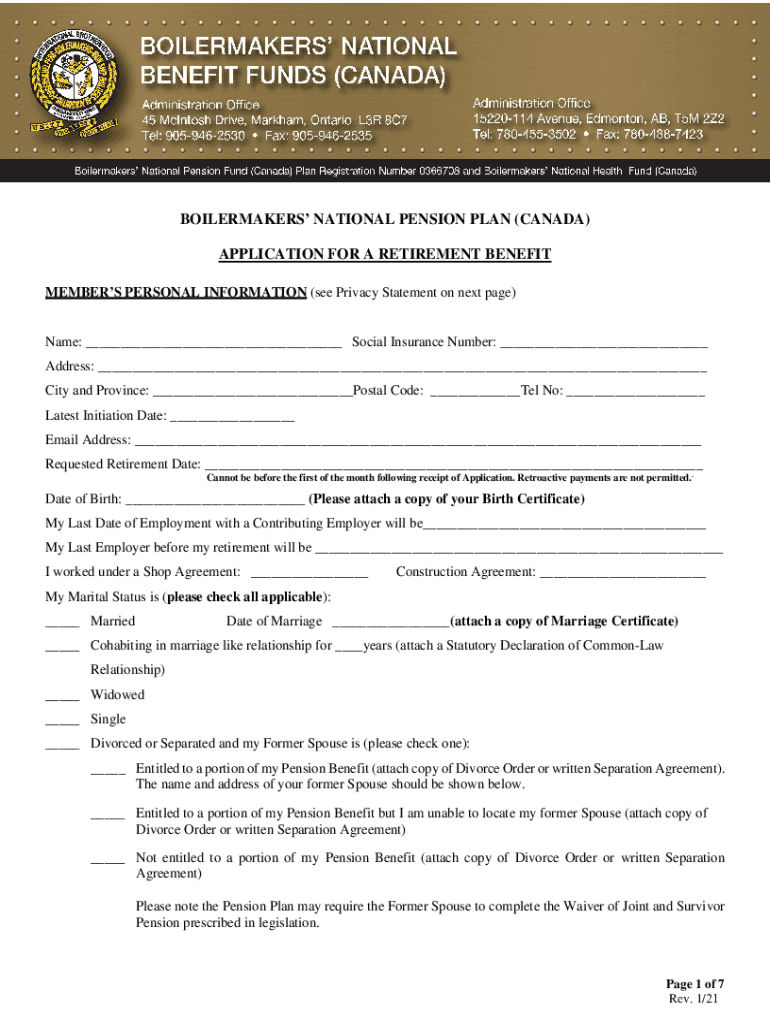 BOILERMAKERS NATIONAL PENSION PLAN (CANADA) APPLICATION FOR A RETIREMENT BENEFIT MEMBERS PERSONAL INFORMATION (see Privacy Statement on next page)Name: ___ Social Insurance Number: ___ Address: ___