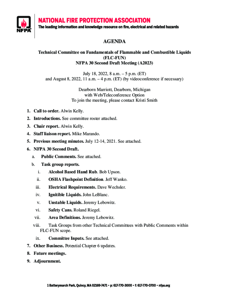 AGENDA Technical Committee on Fundamentals of Flammable and Combustible Liquids (FOCUS) NFPA 30-Second Draft Meeting (A2023) July 18, 2022:8 a.m. 5 p.m. (ET) and August 8, 2022:11 a.m. 4 p.m. (ET)