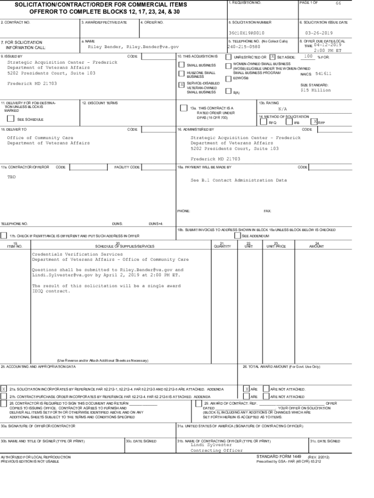 SOLICITATION/CONTRACT/ORDER FOR COMMERCIAL ITEMS OFFER OR TO COMPLETE BLOCKS 12, 17, 23, 24, & 30 2. CONTRACT NO.3. AWARD/EFFECTIVE DATE7. FOR SOLICITATION INFORMATION CALL:a. NAME4. ORDER NO.PAGE
