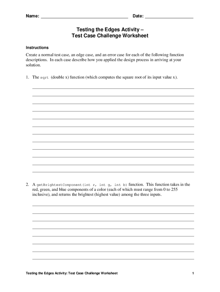 Name: ___Date: ___Testing the Edges Activity Test Case Challenge Worksheet InstructionsCreate a normal test case, an edge case, and an error case for each of the following function descriptions. In