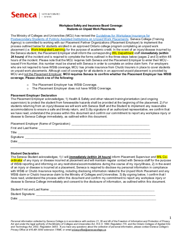 Workplace Safety and Insurance Board Coverage: Students on Unpaid Work Placements The Ministry of Colleges and Universities (MCU) has revised the Guidelines for Workplace Insurance for Postsecondary
