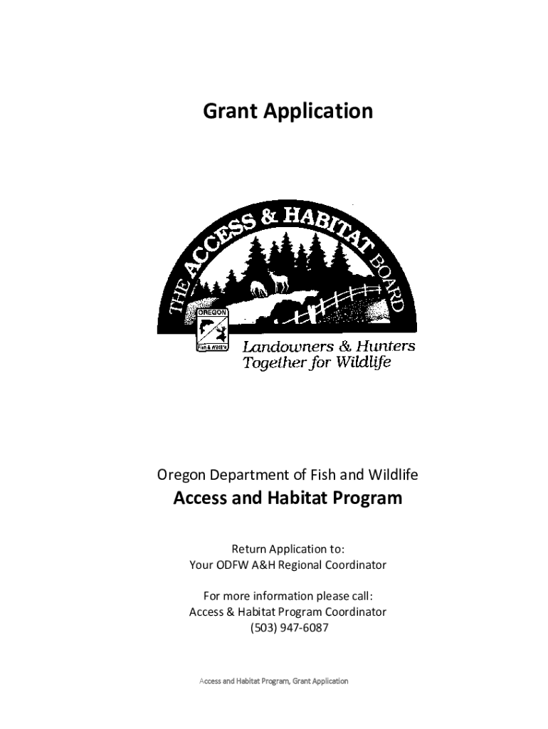 GrantApplication OregonDepartmentofFishandWildlifeAccessandHabitatProgram ReturnApplicationto: YourODFWA&HRegionalCoordinator Formoreinformationpleasecall: Access&HabitatProgramCoordinator (503)9476087