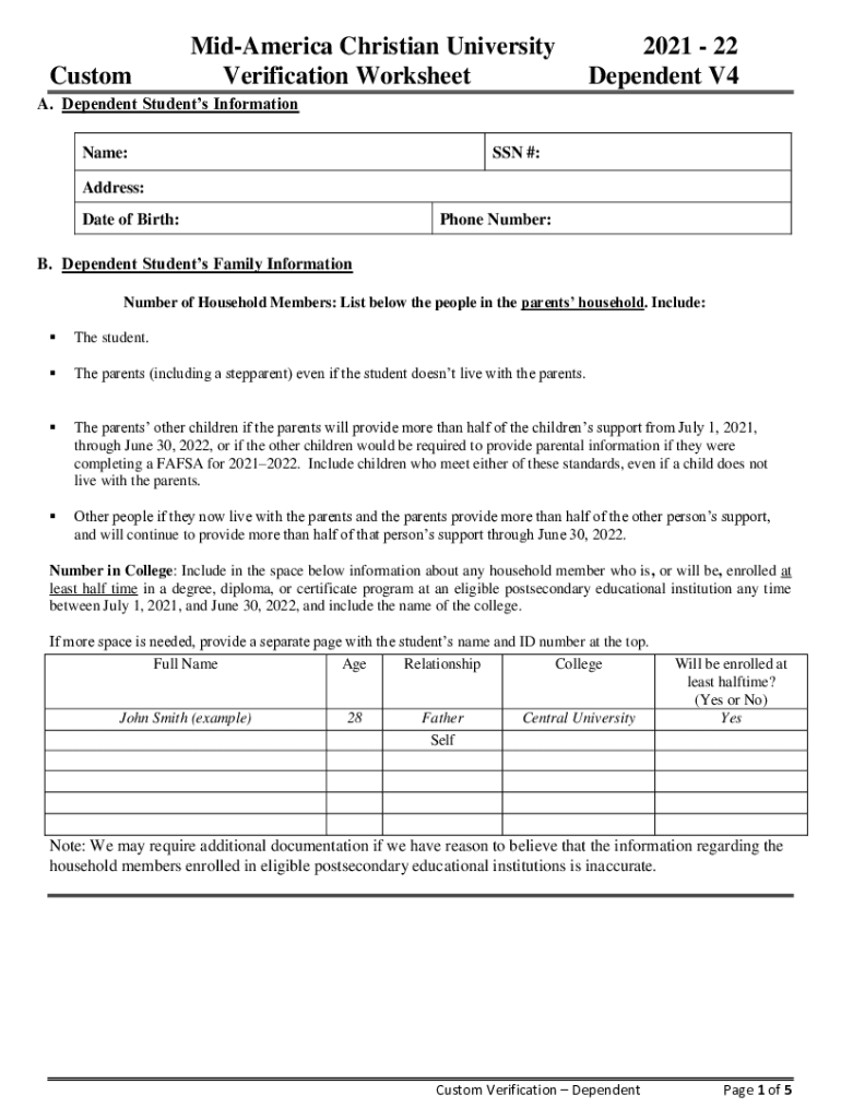 CustomMidAmerica Christian University Verification Worksheet2021 22 Dependent V4A. Dependent Students Information Name:SSN #:Address: Date of Birth:Phone Number:B. Dependent Students Family Information