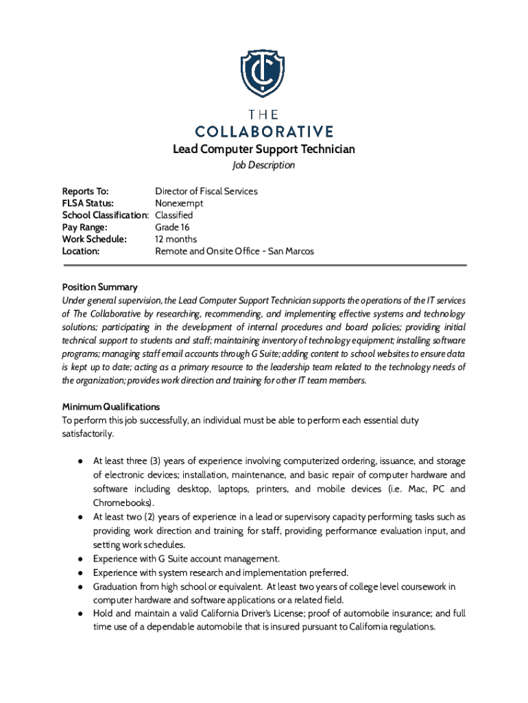 Lead Computer Support Technician Job Description Reports To: FLEA Status: School Classification: Pay Range: Work Schedule: Location:Director of Fiscal Services Nonexempt Classified Grade 16 12 months