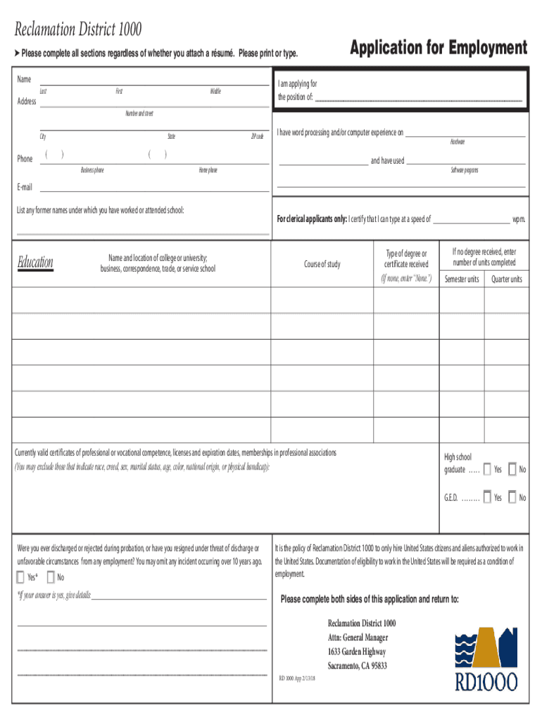 Obtain the reclamation district 1000 employment form from the official website or office.