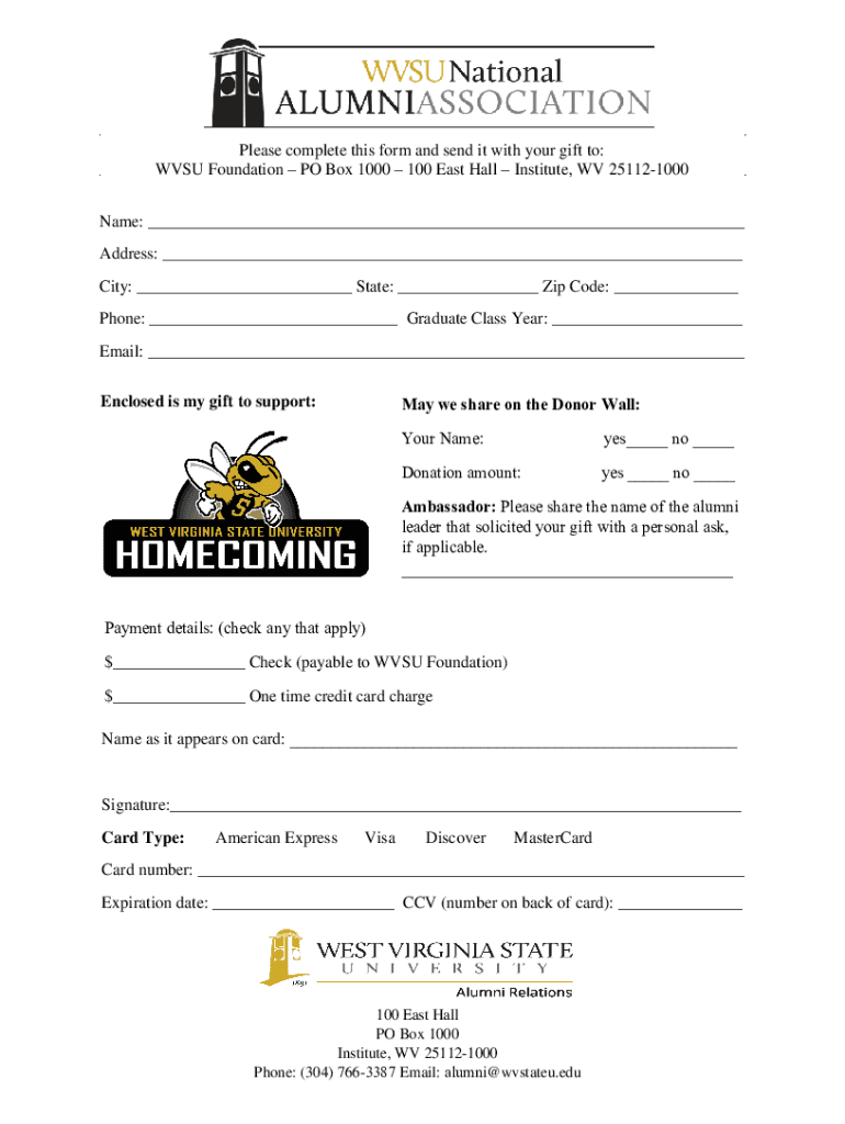 Please complete this form and send it with your gift to: WSU Foundation PO Box 1000 100 East Hall Institute, WV 251121000 Name: ___ Address: ___ City: ___ State: ___ Zip Code: ___ Phone: ___ Graduate