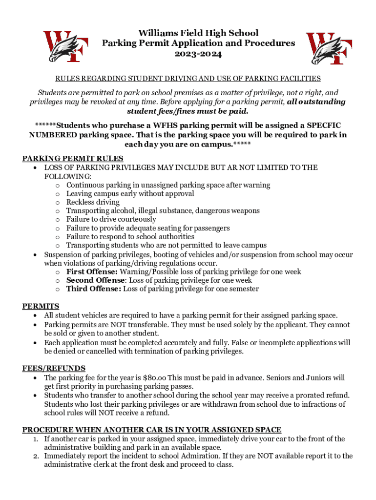 Williams Field High School Parking Permit Application and Procedures 20232024 RULES REGARDING STUDENT DRIVING AND USE OF PARKING FACILITIES Students are permitted to park on school premises as a matter