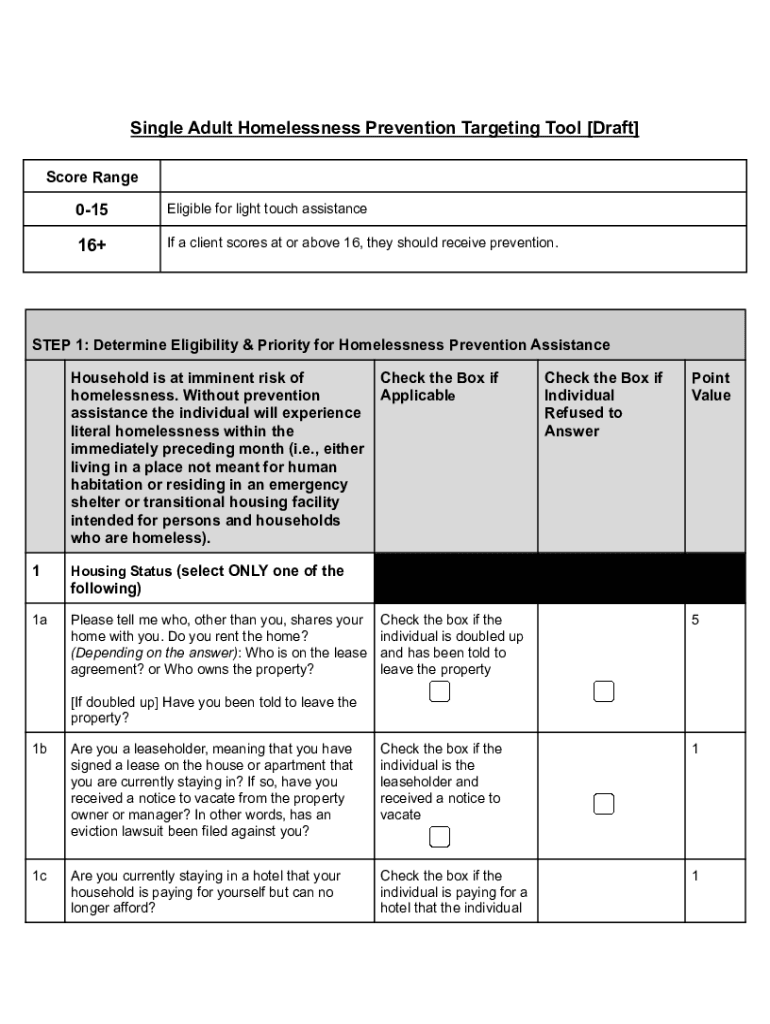 Single Adult Homelessness Prevention Targeting Tool [Draft] Score Range015Eligible for light touch assistance16+If a client scores at or above 16, they should receive prevention. STEP 1: Determine