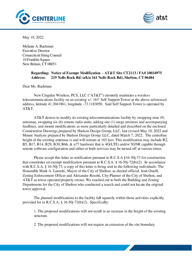 May 19, 2022, Melanie A. Bach man Executive Director Connecticut Siting Council 10 Franklin Square New Britain, CT 06051 Regarding: Notice of Exempt Modification AT&T Site CT2113 / FA# 10034975 Address: