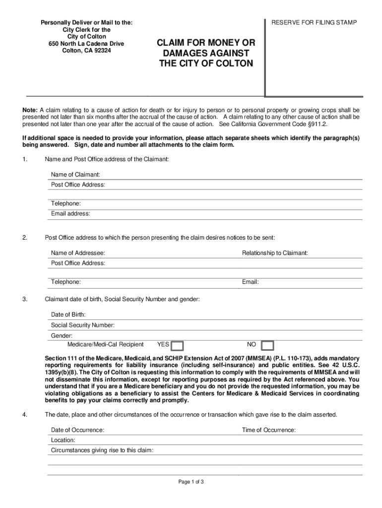 Personally Deliver or Mail to the: City Clerk for the City of Colton 650 North La Cadenza Drive Colton, CA 92324RESERVE FOR FILING STAMPCLAIM FOR MONEY OR DAMAGES AGAINST THE CITY OF Colonnade: A