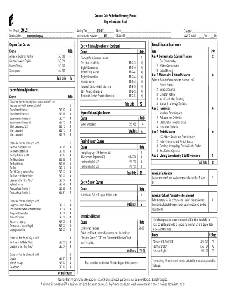 California State Polytechnic University, PomonaDegree Curriculum SheetENGLISH