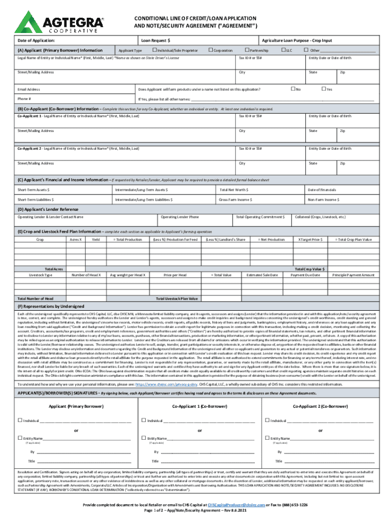 CONDITIONAL LINE OF CREDIT/LOAN APPLICATION AND NOTE/SECURITY AGREEMENT (AGREEMENT) Date of Application:Loan Request $(A) Applicant (Primary Borrower) InformationApplicant TypeAgriculture Loan Purpose