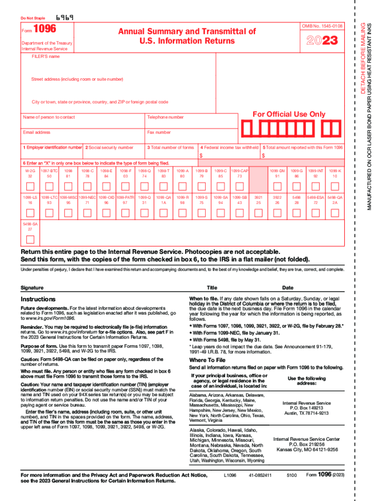 Form 1096 is a summary form used to transmit paper Forms 1099, 1098, 5498, or W-2G to the IRS. When it comes to dividends, it is used to report and summarize dividend payments.