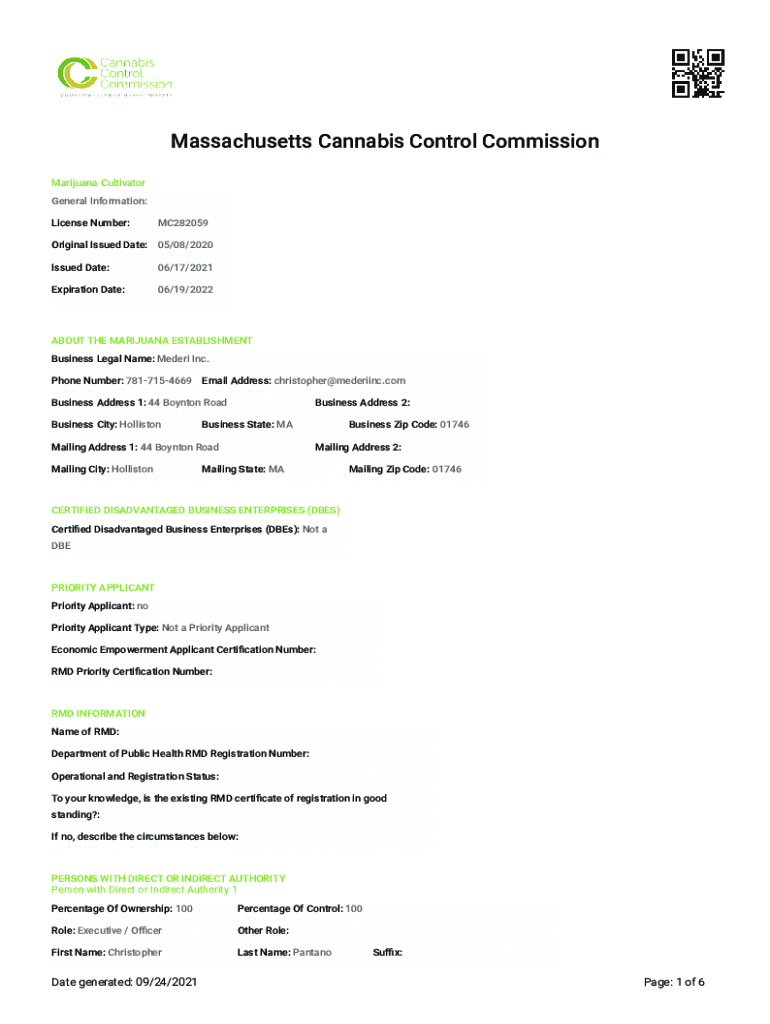 Massachusetts Cannabis Control Commission Marijuana Cultivator General Information: License Number:MC282059Original Issued Date: 05/08/2020 Issued Date:06/17/2021Expiration Date:06/19/2022ABOUT THE