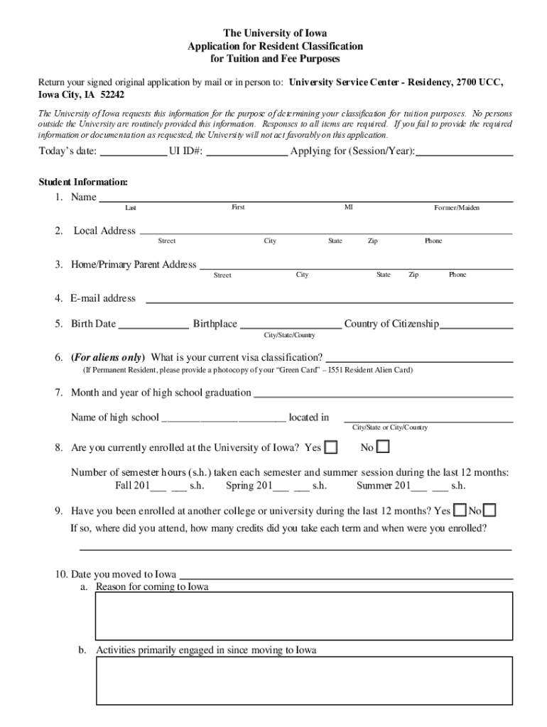 The University of Iowa Application for Resident Classification for Tuition and Fee Purposes Return your signed original application by mail or in person to: University Service Center Residency, 2700