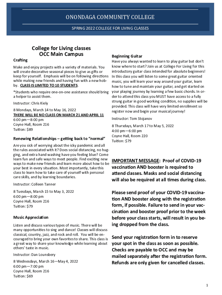 SPRING 2022 COLLEGE FOR LIVING CLASSESCollege for Living classes