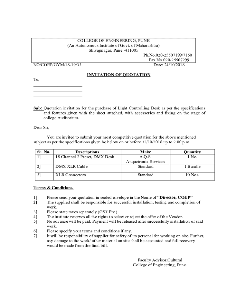 The purpose of quotation invitation is to obtain competitive prices and select the most suitable supplier/vendor through a fair and transparent process.