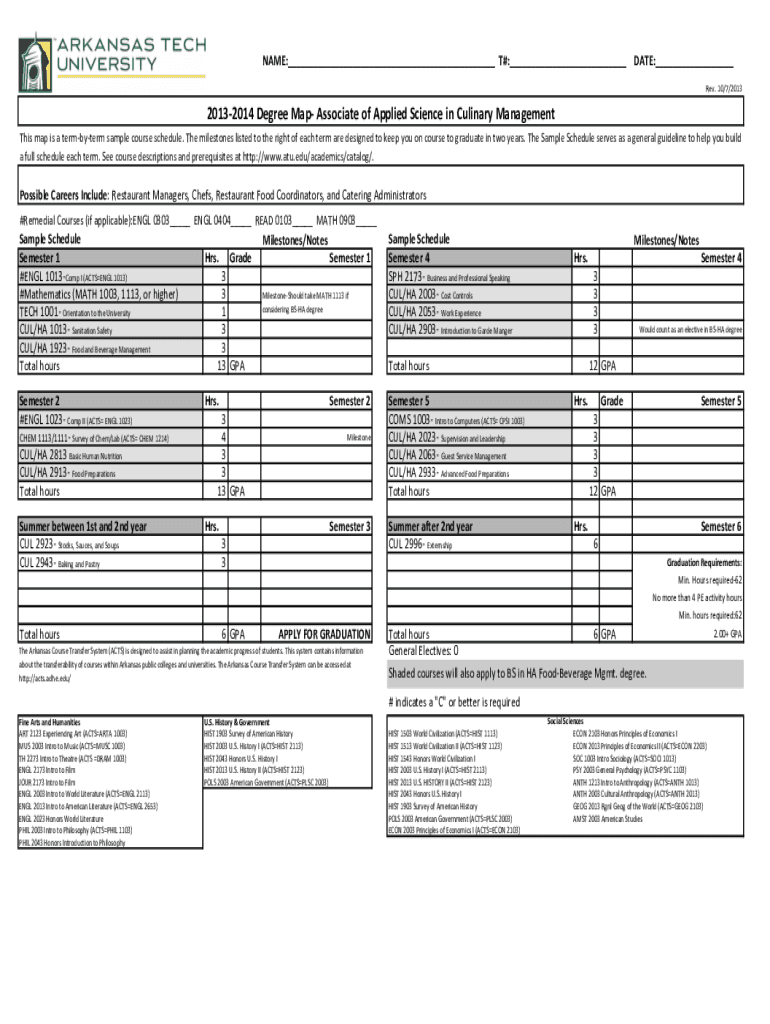 NAME:___ T#:___ DATE:___ Rev. 10/7/201320132014 Degree Map Associate of Applied Science in Culinary Management This map is a terabytes sample course schedule. The milestones listed to the right of