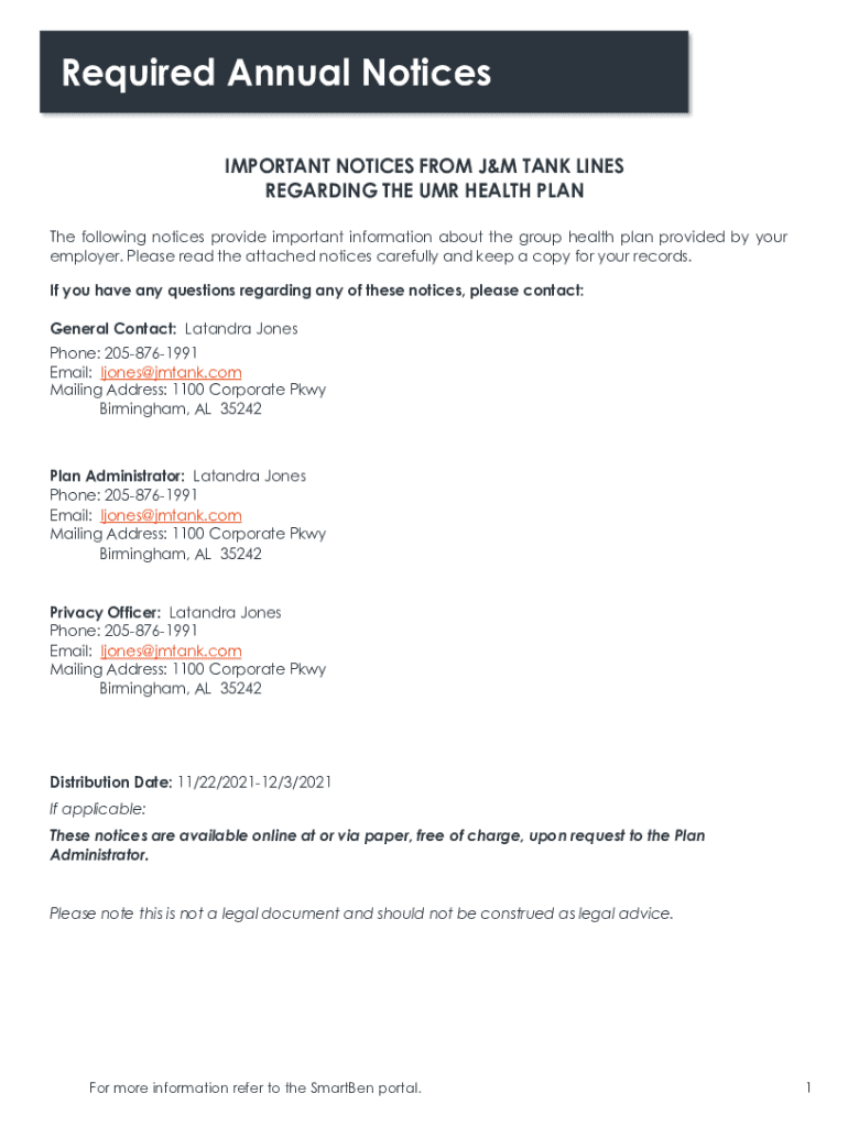 Required Annual Notices IMPORTANT NOTICES FROM J&M TANK LINES REGARDING THE UMR HEALTH PLAN The following notices provide important information about the group health plan provided by your employer.