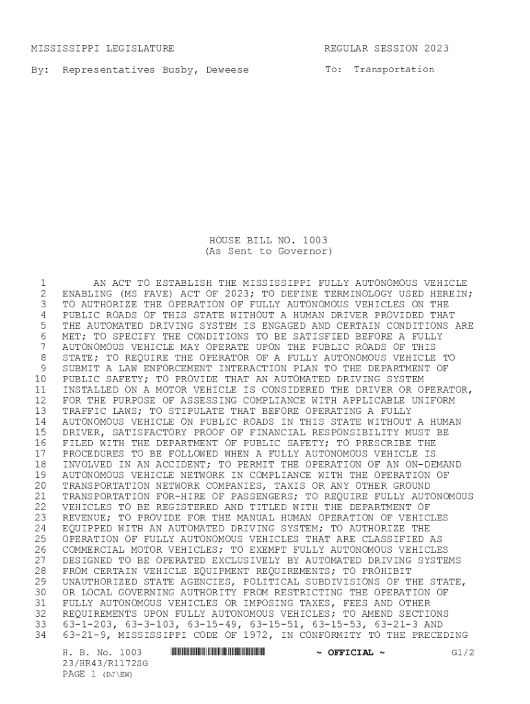 MISSISSIPPI LEGISLATUREREGULAR SESSION 2023By:To:Representatives Busby, DeweeseTransportationHOUSE BILL NO. 1003 (As Sent to Governor) 1 2 3 4 5 6 7 8 9 10 11 12 13 14 15 16 17 18 19 20 21 22 23 24