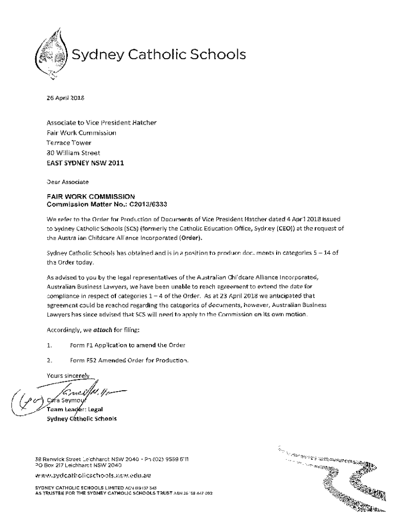 Sydney Catholic Schools26 April 2018Associate to Vice President Hatcher Fair Work Commission Terrace Tower 80 William StreetEasy SYDNEY NSW 2011 Dear AssociateFAIR WORK COMMISSION Matter No.: C2013/6333