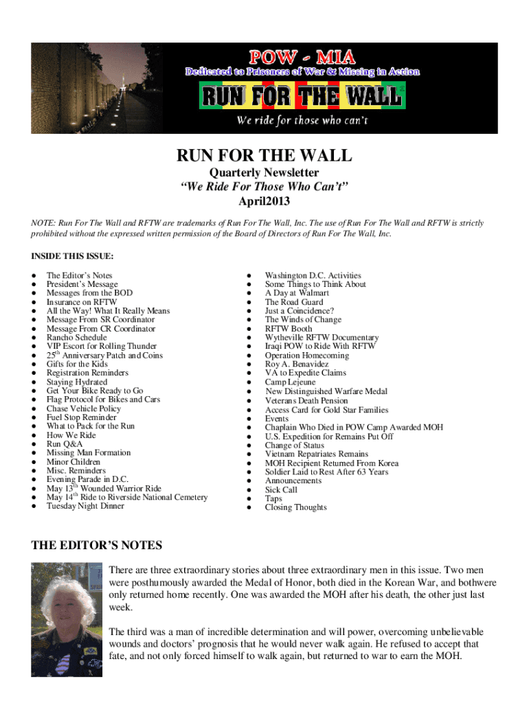 RUN FOR THE WALL Quarterly Newsletter We Ride For Those Who Can't April2013 NOTE: Run For The Wall and FTW are trademarks of Run For The Wall, Inc. The use of Run For The Wall and FTW is strictly