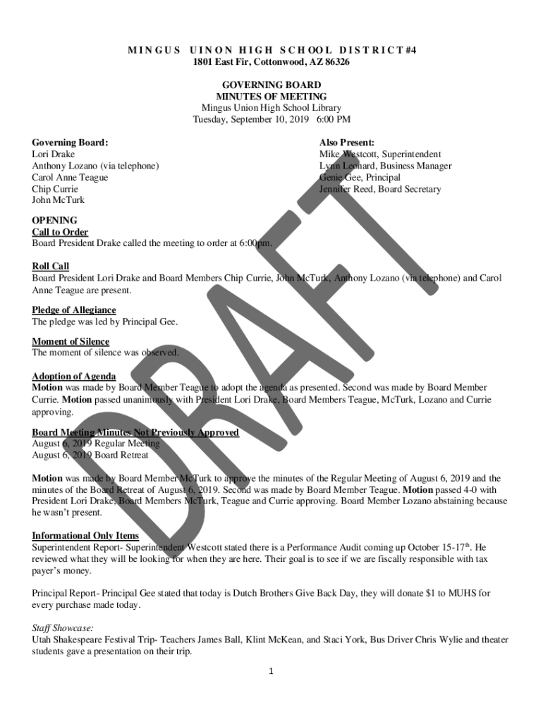 MINGUS I N O N H I G H S C H OO L D I S T R I C T #4 1801 East Fir, Cottonwood, AZ 86326 GOVERNING BOARD MINUTES OF MEETING Mingus Union High School Library Tuesday, September 10, 2019 6:00 Governing