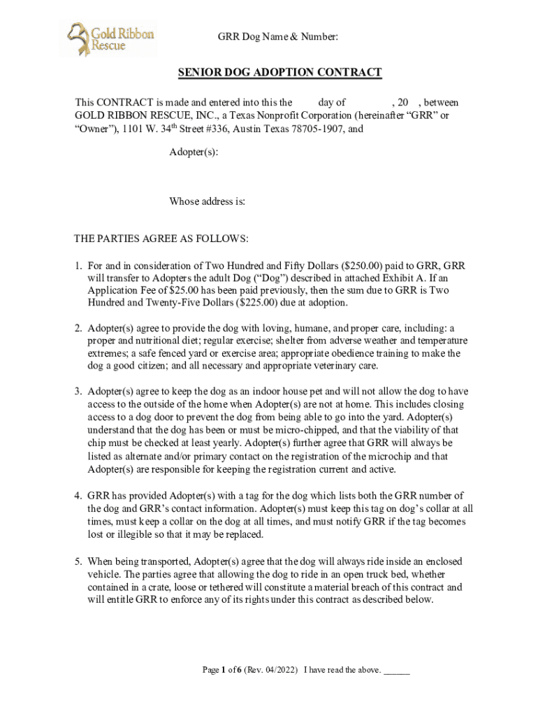 GRR, Dog Name & Number:SENIOR DOG ADOPTION CONTRACT, 20, between This CONTRACT is made and entered into this the day of GOLD RIBBON RESCUE, INC., a Texas Nonprofit Corporation (hereinafter GRR or