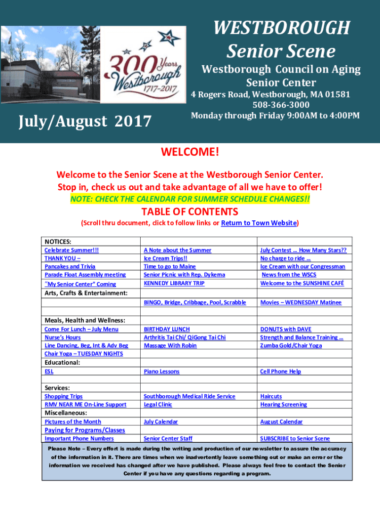 NEWBOROUGH Senior Scene West borough Council on Aging Senior Center4 Rogers Road, West borough, MA 01581 5083663000 Monday through Friday 9:00AM to 4:00PMJuly/August 2017WELCOME! Welcome to the Senior