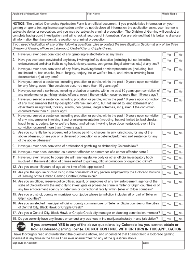 Colorado Limited Ownership ApplicationCOLORADO DIVISION OF GAMING 1707 Cole Blvd., Suite 300, Lakewood, CO 80401 (303) 2051300 / (303) 2051342 (fax)DR 9500B (02/27/23)Applicants Printed Last NameFirst