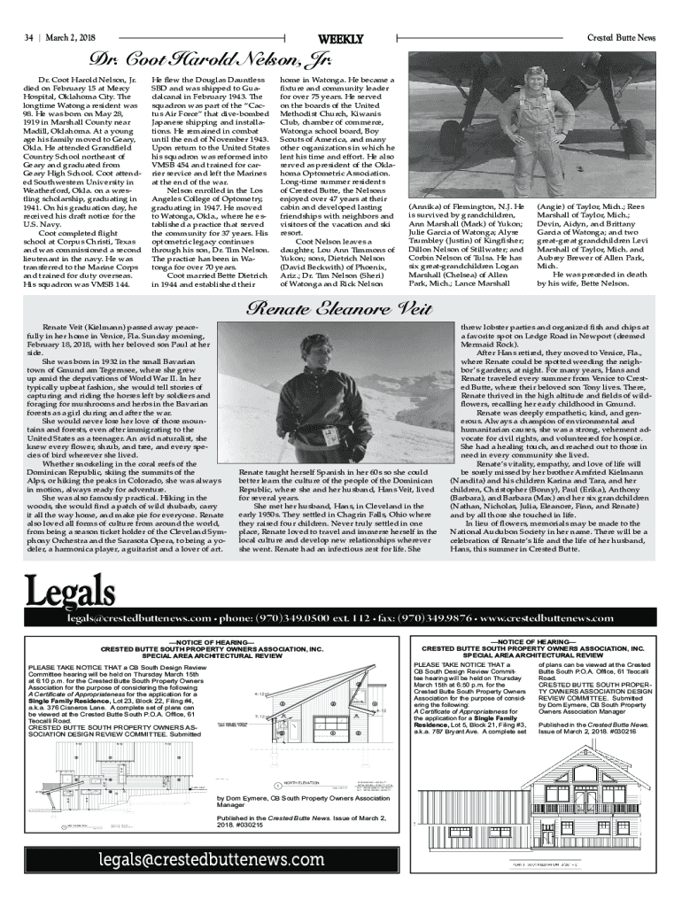 Crested Butte2,News 34 | March 2018March 2018 News | 1 Crested2,ButteWEEKLYDr. Coot Harold Nelson, Jr. Dr. Coot Harold Nelson, Jr. died on February 15 at Mercy Hospital, Oklahoma City. The longtime